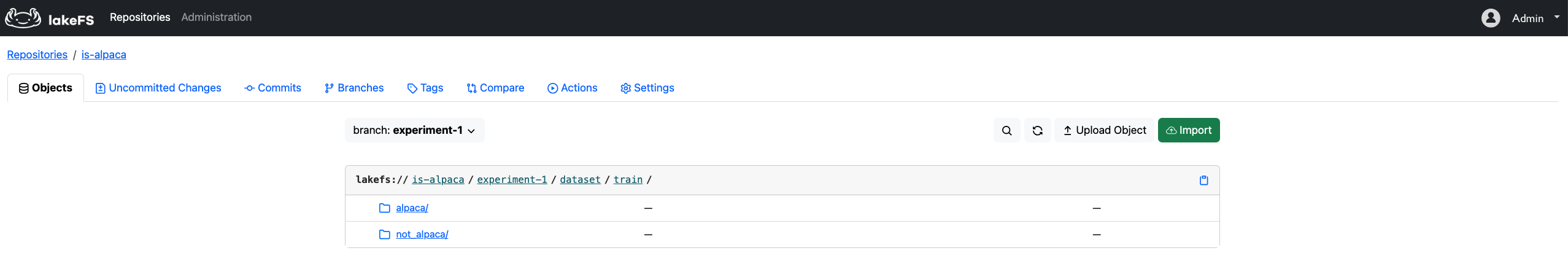 Let's create a new lakeFS branch called experiment-1. Our is_alpaca dataset is accessible on that branch,
