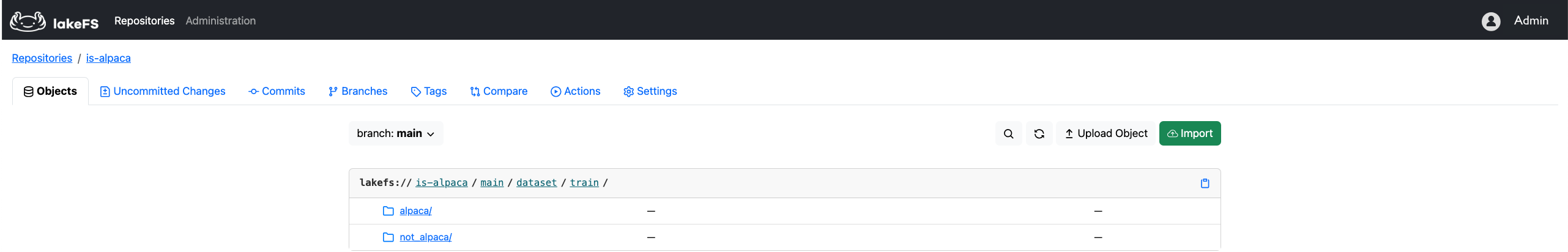 We also created a lakeFS repository and uploaded the is_alpaca train dataset