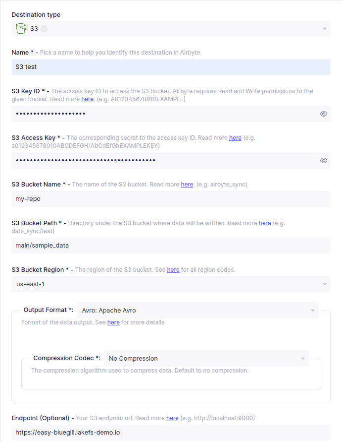 | S3 Bucket Name | The lakeFS repository where the data will be written | example-repo |