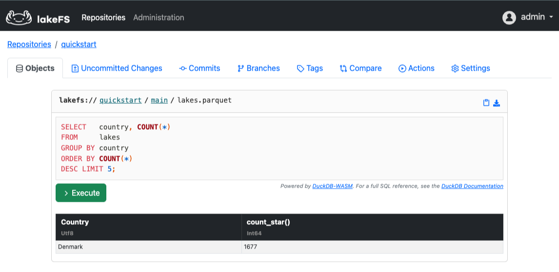 SELECT country, COUNT() FROM READ_PARQUET('lakefs://quickstart/denmark-lakes/lakes.parquet') GROUP BY country ORDER BY COUNT() DESC LIMIT 5; ```