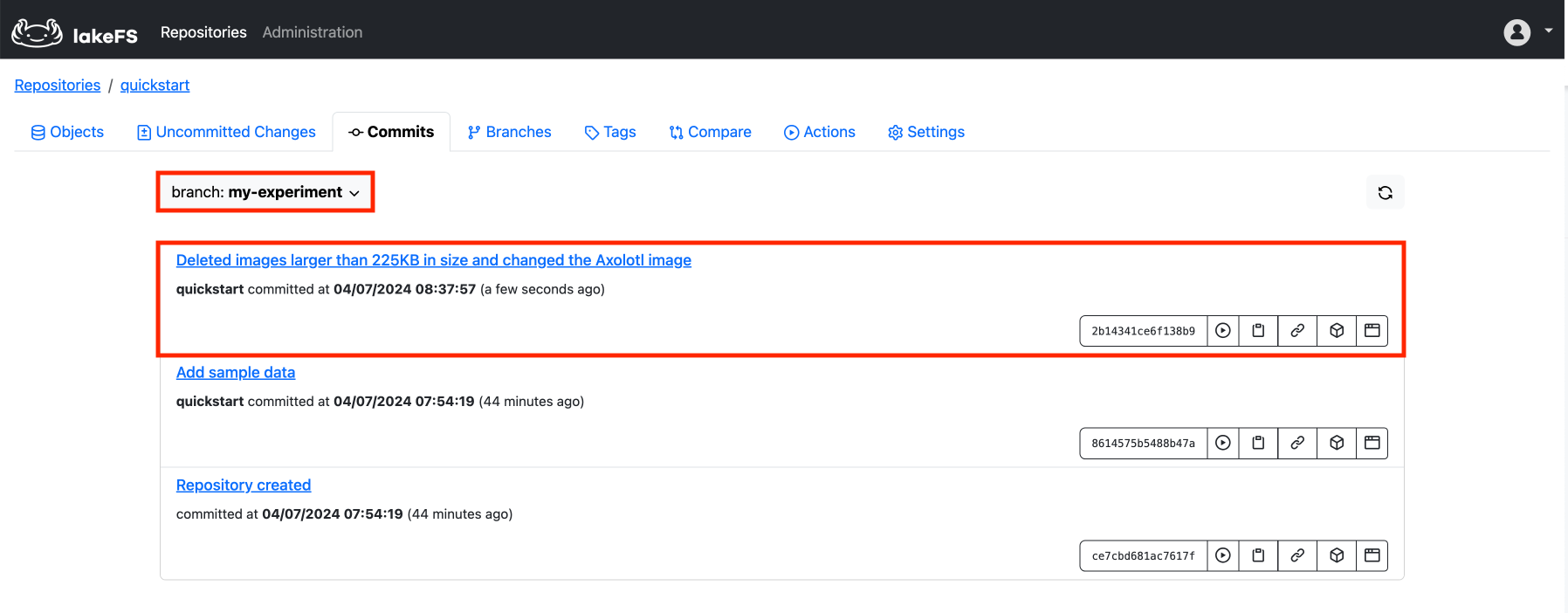 bash lakectl local commit -m 'Deleted images larger than 225KB in size and changed the Axolotl image' my_local_dirIn your branch, you should see the commit including your local changes: