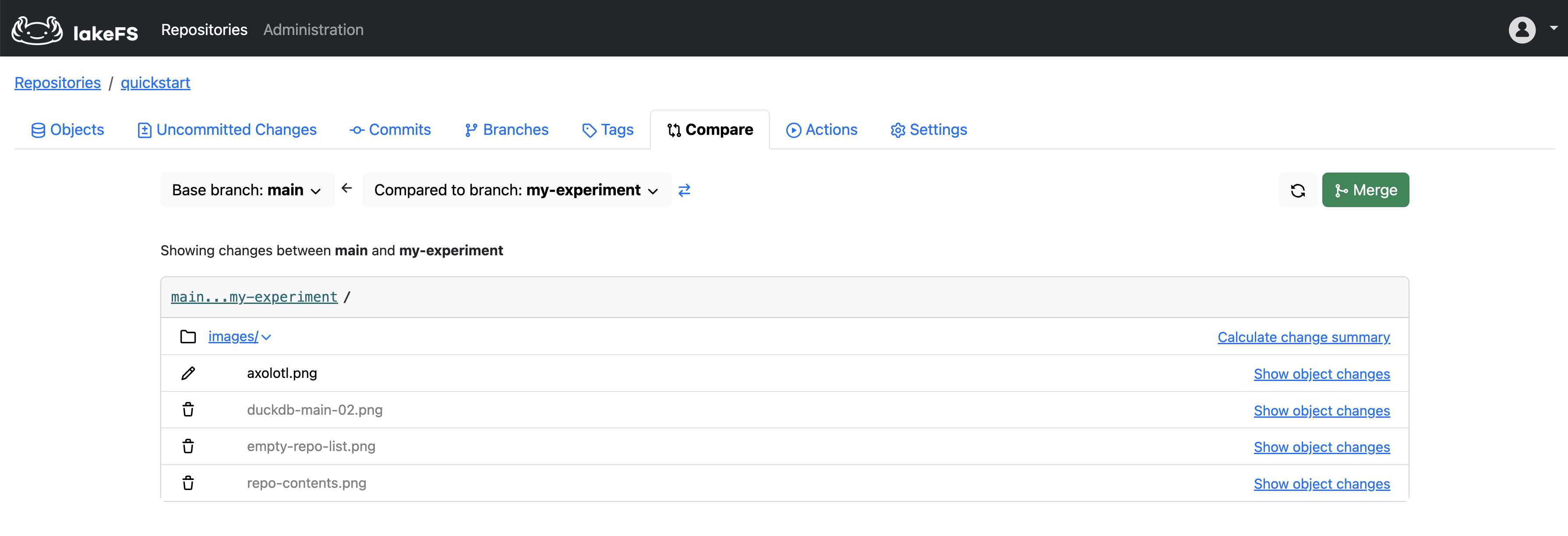 my-experiment. You can do this through the UI or withlakectl:bash lakectl branch create lakefs://quickstart/my-experiment --source lakefs://quickstart/main - Clone images from your quickstart repository into a local directory named
